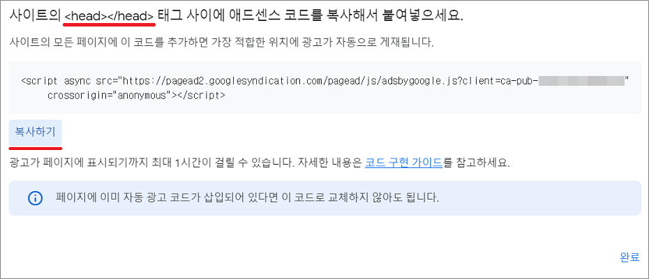2. 복사하기 선택하면 자동으로 애드센스 코드가 복사됩니다.