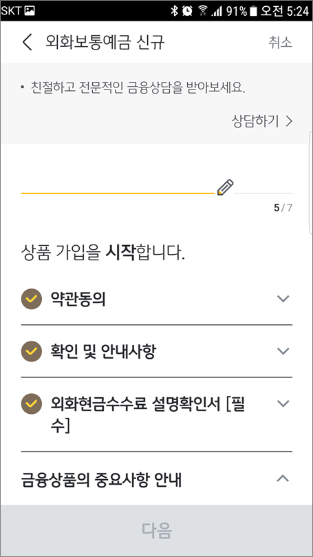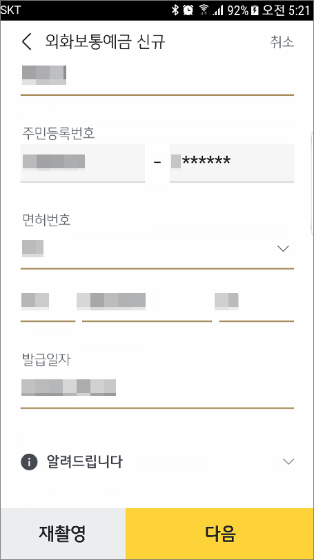 국민은행 외화통장 개설 절차 중 주민등록증 또는 운전면허증 촬영이 어려우면 모바일 운전면허증으로 인증하면 신분증 촬영 절차를 대신할 수 있습니다.