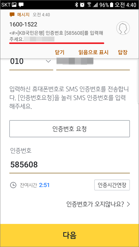 15. 문자 메시지가 오면 인증번호는 자동입력되고 자동으로 입력되지 않으면 직접 입력합니다.