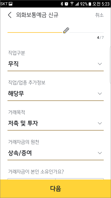 24. 직업구분, 직업/업종 추가정보, 거래목적, 거래자금의 원천에 대한 정보를 모두 입력해야 합니다.