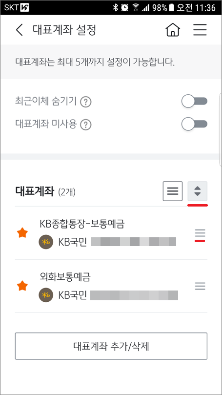2. 대표계좌 추가/삭제 선택합니다.