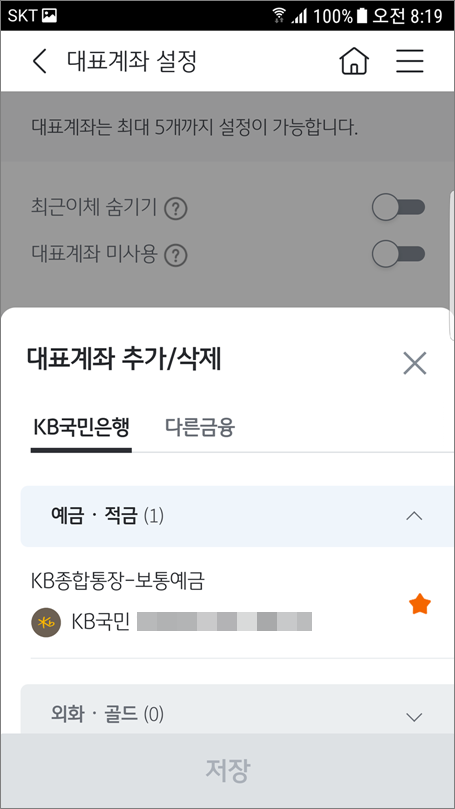 국민은행 KB스타뱅킹 대표계좌 설정에서 다른 계좌를 추가하는 방법입니다.