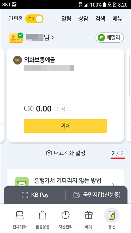 10. 대표계좌를 옆으로 이동시키면 추가된 다른 대표계좌의 잔액조회를 확인할 수 있습니다.