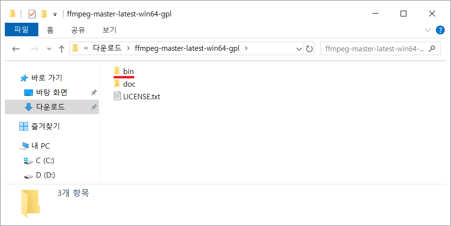 8. ffmpeg-master-latest-win64-gpl 폴더 안에는 bin 폴더와 doc 폴더 2개가 있습니다.