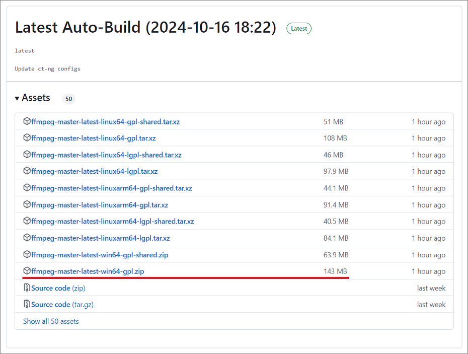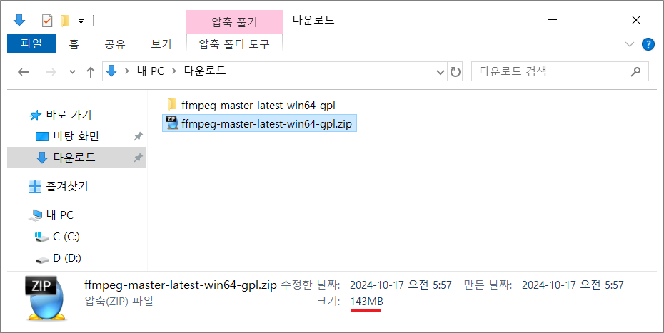 ffmpeg-master-latest-win64-gpl.zip 용량은 143m이고 압축을 풀면 385m입니다.