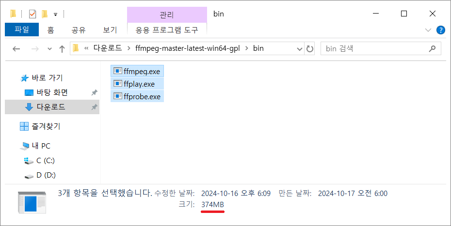 9. bin 폴더 안에는 ffmpeg.exe, ffplay.exe, ffprobe.exe 파일 3개가 있습니다.