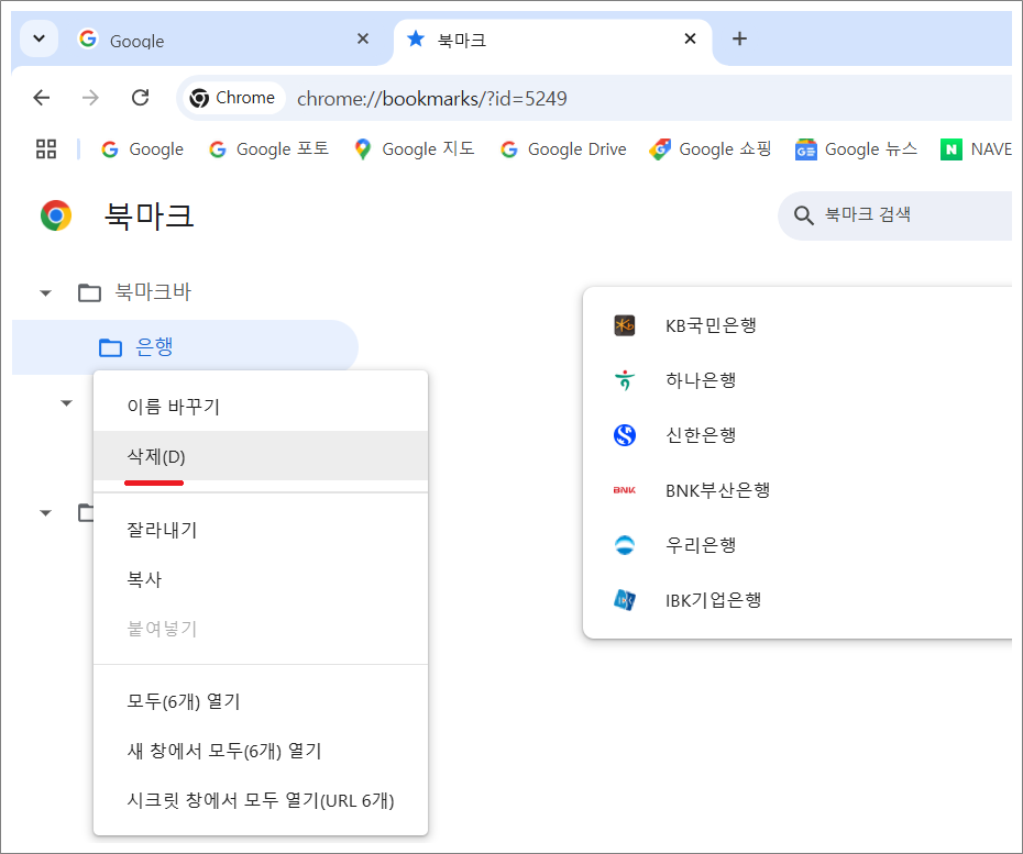 크롬 북마크바에 저장된 15개 북마크, 은행 폴더에 저장된 6개의 북마크, 가져온 북마크 폴더에 저장된 4개의 북마크, 모든 북마크 폴더에 저장된 4개의 북마크를 삭제하는 방법입니다.