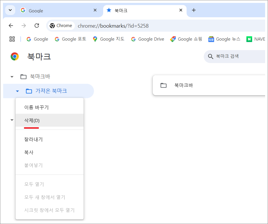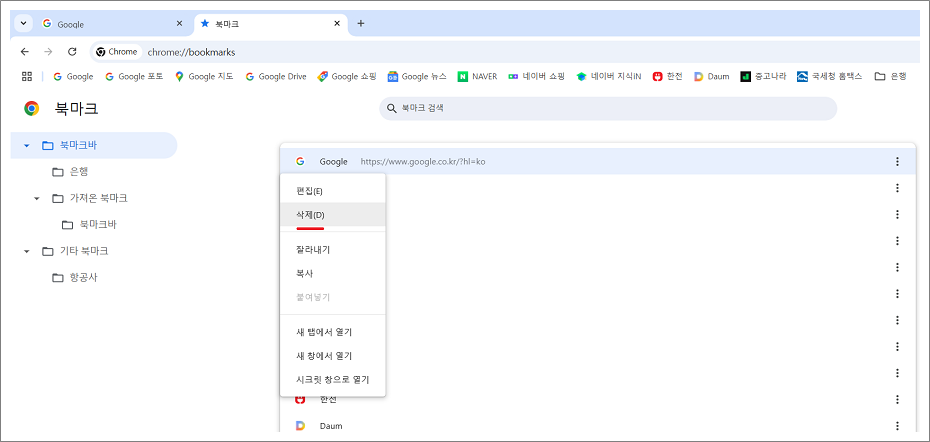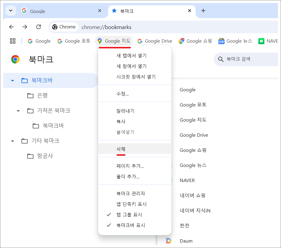 2. 북마크바에서는 삭제한 북마크 위에 마우스 우측 버튼을 누르고 삭제 선택합니다.