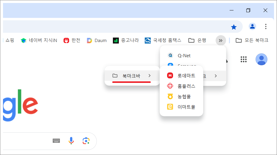 크롬에 북마크가 추가되는 기본 장소는 북마크바 폴더에 저장됩니다.