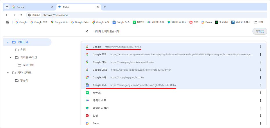 크롬 북마크 관리자에서는 마우스 드래그가 안되기 때문에 키보드 단축키인 Shift 키와 Ctrl 키를 사용해야 합니다.