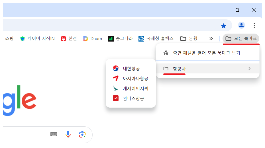 4. 모든 북마크 폴더에는 항공사 폴더가 있고 4개의 북마크가 저장되어 있습니다.