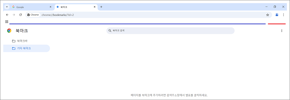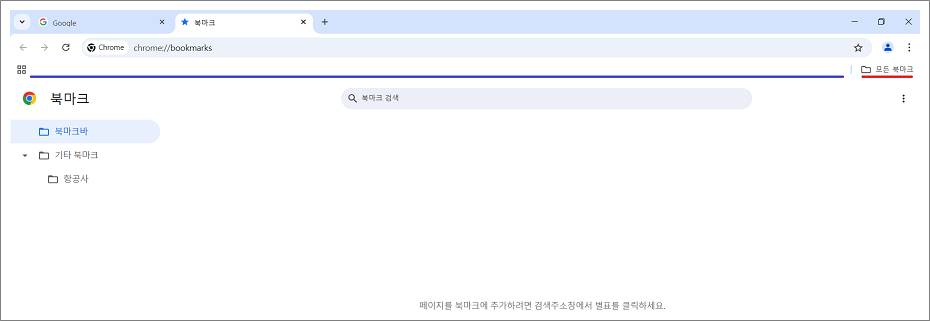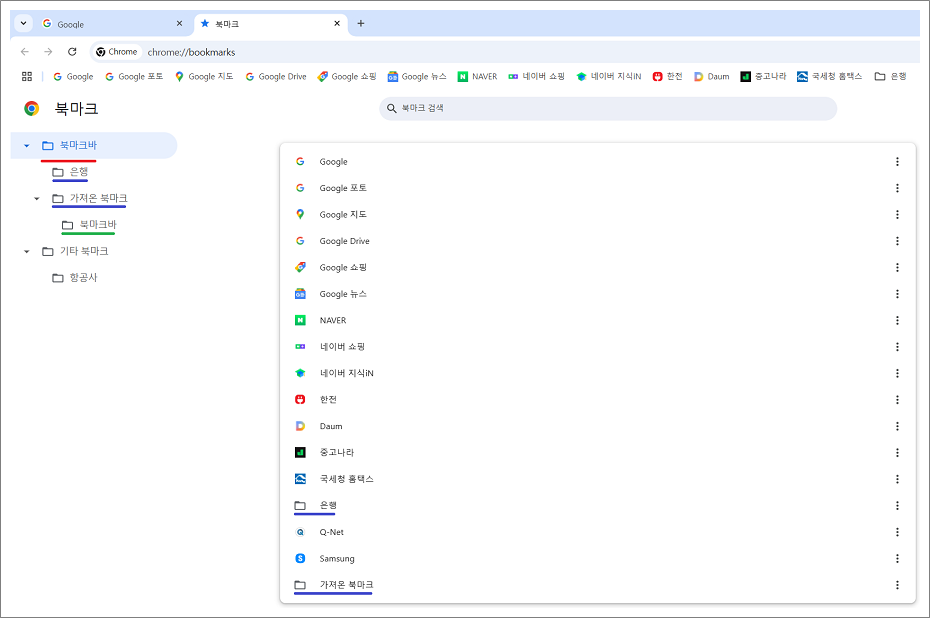 1. 크롬의 북마크바에는 북마크, 폴더, 가져온 북마크가 있는 상태이고 모든 북마크 폴더도 북마크가 저장된 상태입니다.