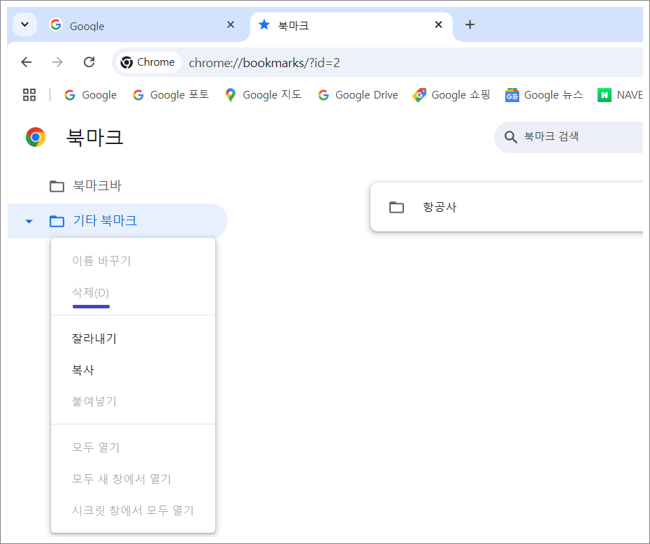 2. 기타 북마크 폴더는 삭제 메뉴가 비활성화되어 있습니다.