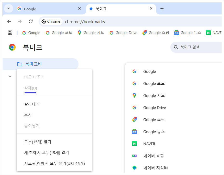 1. 북마크바 폴더는 삭제 메뉴가 비활성화되어 있습니다.