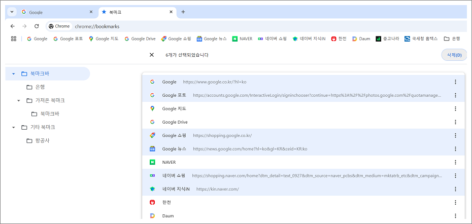 2. 북마크가 정렬되어 있지 않은 상태에서 부분 삭제할 경우에는 Ctrl 키를 누른 상태에서 삭제할 북마크를 선택해서 블록을 지정합니다.
