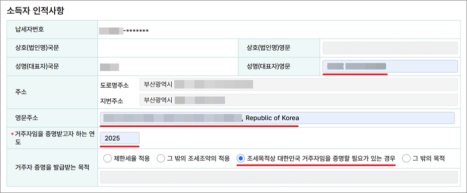8-1. 소득자 인적사항에서 영문이름, 영문주소, 거주자임을 증명받고자 하는 연도를 입력하고 거주자 증명을 발급받는 목적에 체크합니다.