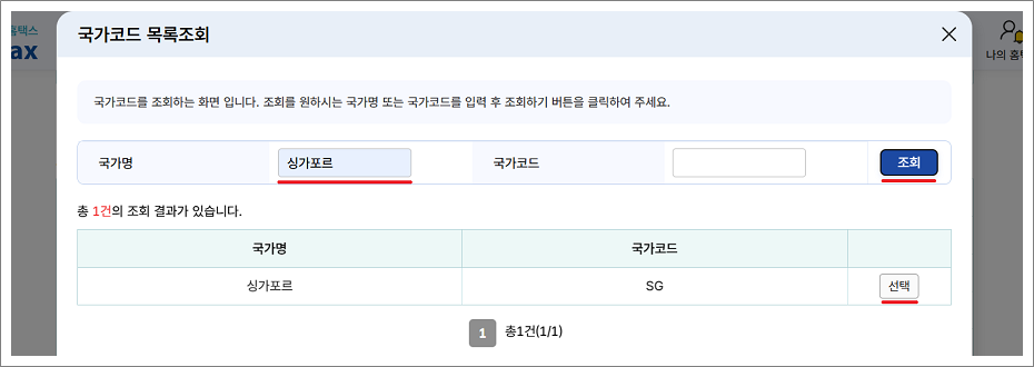 8-3. 코드검색을 선택한 후 국가명에 싱가포르를 입력한 후 조회를 하고 선택합니다.