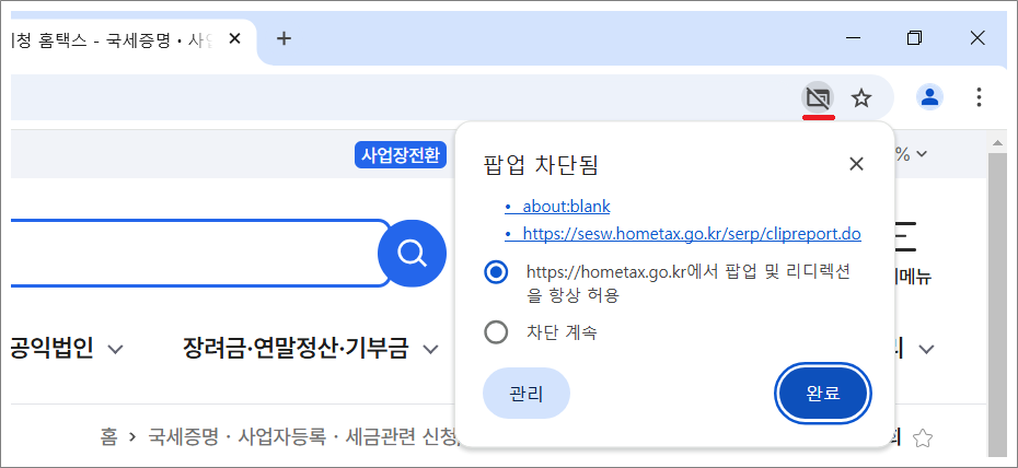 팝업창이 나오지 않으면 출력은 다시 선택하거나 오른쪽 상단의 팝업 허용으로 선택합니다.