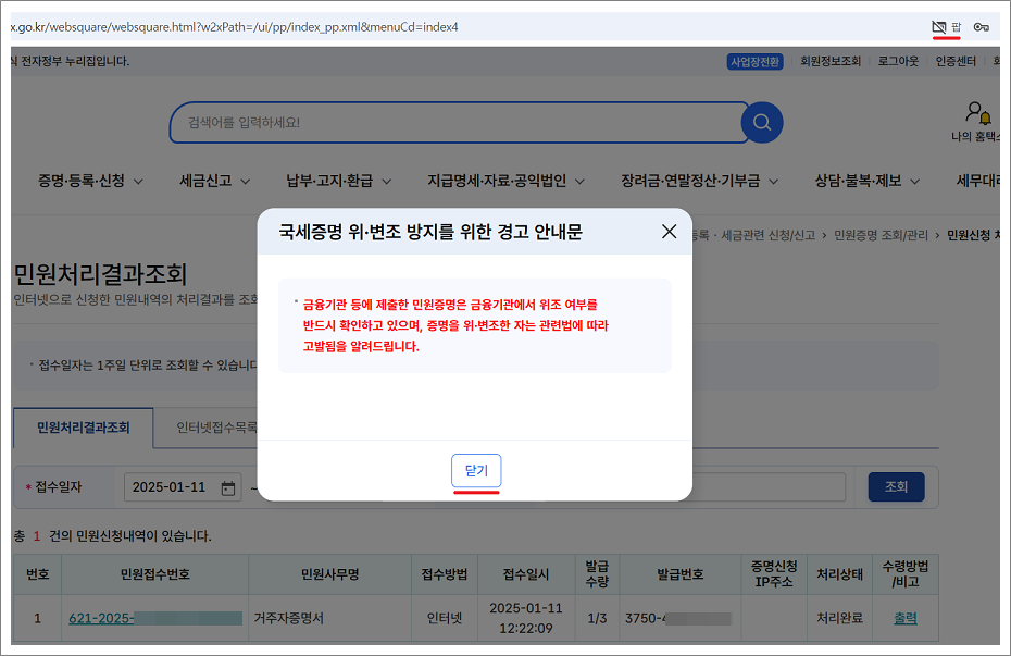 17. 닫기를 선택하면 거주자 증명서 팝업창이 나옵니다.