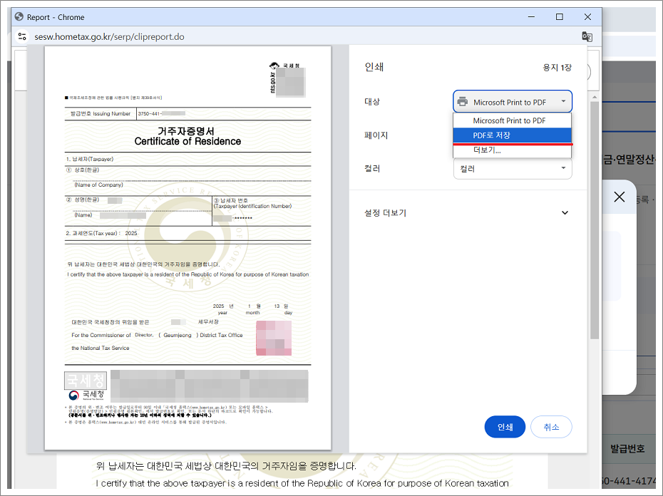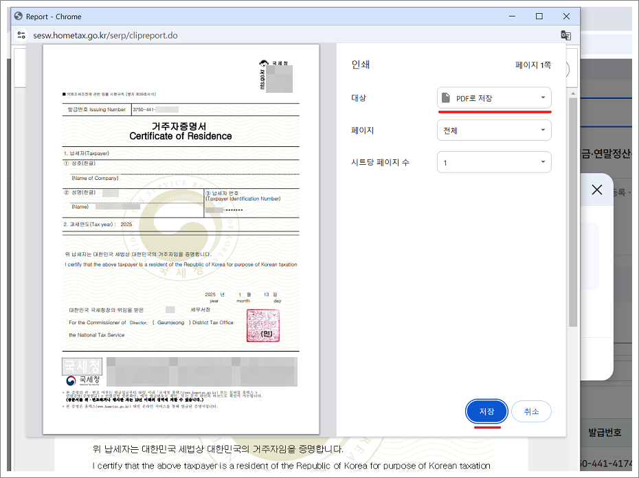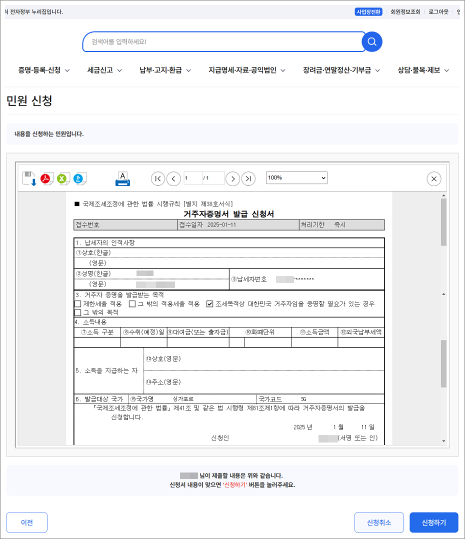 1. 홈택스에서 싱가포르 거주자 증명서 신청하고 거주자 증명서를 PDF 파일로 다운로드합니다.