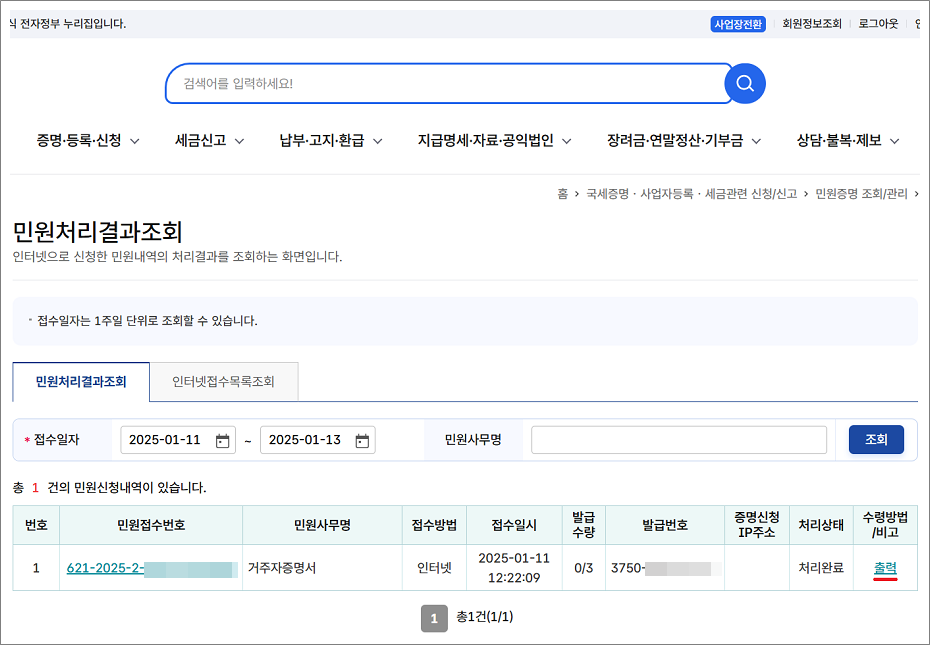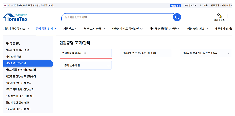 14. 증명.등록.신청 > 민원증명 조회/관리 > 민원신청 처리결과 조회 선택합니다.