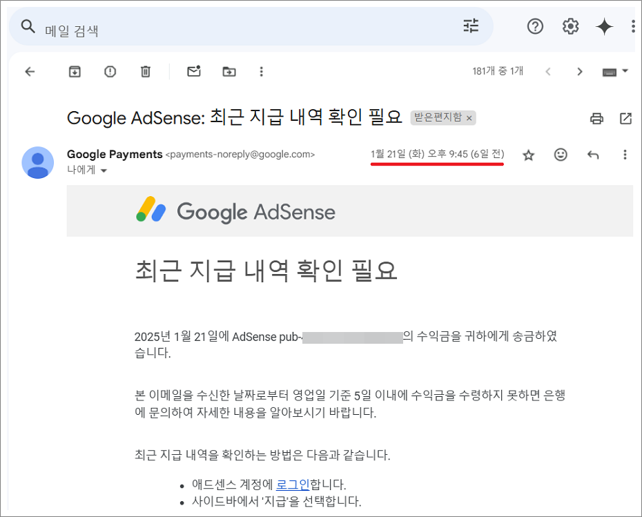 8. 애드센스 수익 지급이 완료되면 이메일로 확인 내용이 옵니다.