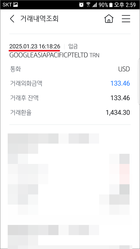 11. 애드센스 송금은 2025년 1월 21일 오후 9시 45분이지만 실제 계좌에 입금은 2025년 1월 23일 오후 4시 18분입니다.