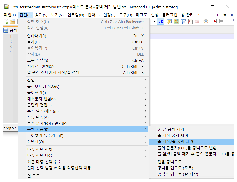 노트패드 Notepad++ 텍스트 파일 공백 제거 방법은 편집 메뉴에서 공백 기능을 찾아서 줄 시작/끝 공백 제거 선택합니다.