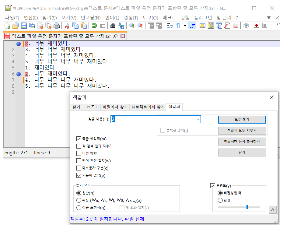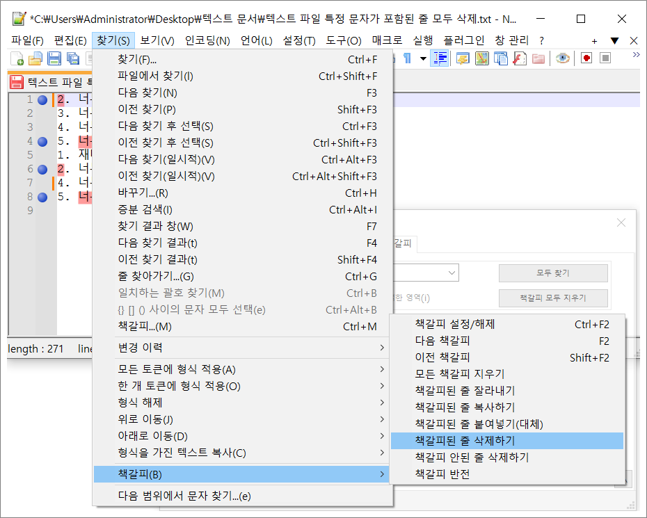 13. 찾기 > 북마크(B) > 책갈피된 줄 삭제하기 선택합니다.
