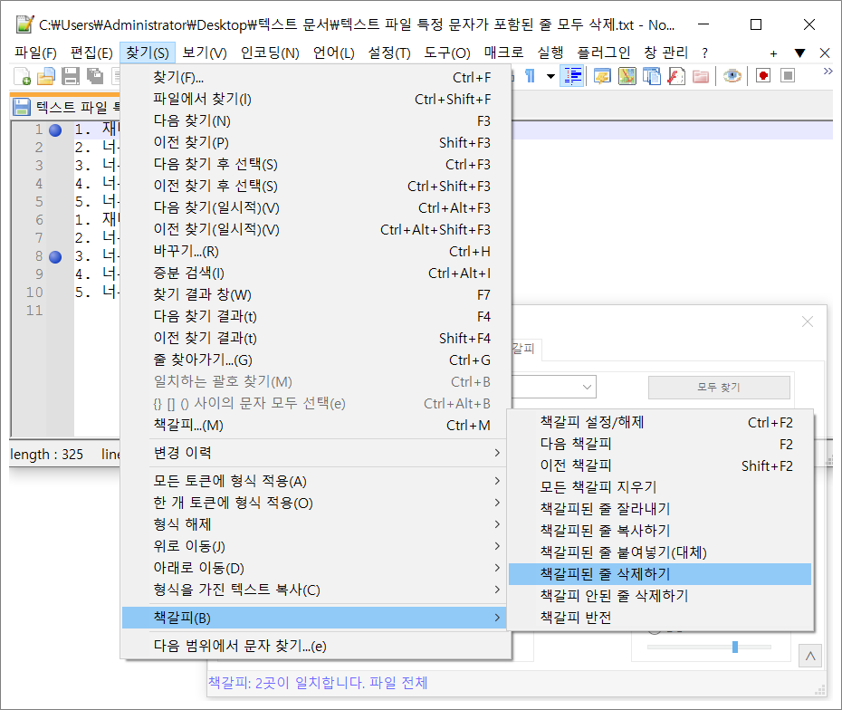 2. 찾기 > 책갈피 > > 책갈피된 줄 삭제하기 선택합니다.
