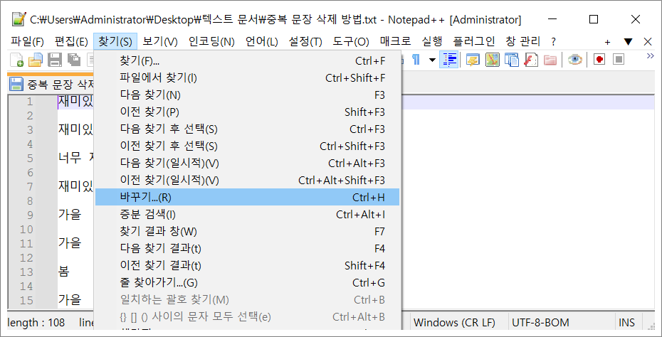 1. 텍스트 파일에 빈 줄이 포함된 경우에는 편집 메뉴에서 중복된 줄 삭제가 안되기 때문에 바꾸기 메뉴에서 실행해야 합니다.