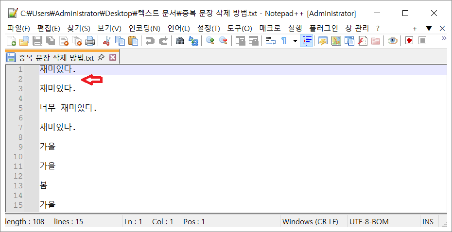 노트패드 Notepad++ 텍스트 파일에 중복된 줄 제거는 중복된 문장, 단어, 기호 모두 삭제 가능합니다.