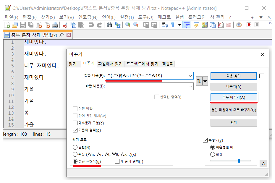 3. 찾을 내용에는 ^(.*?)$\s+?^(?=.*^\1$) 입력하고 바꿀 내용에는 빈칸입니다.
