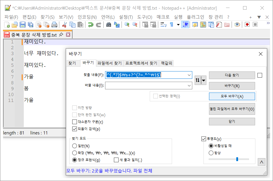 찾기 모는 정규식에 체크하고 모두 바꾸기 선택합니다.