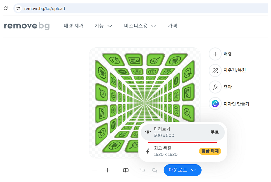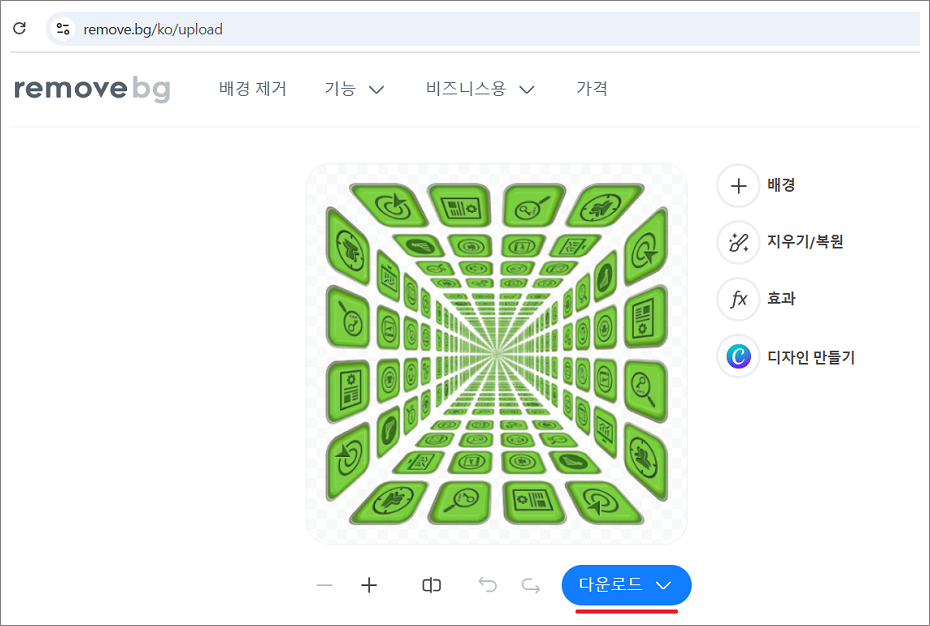 4. 업로드한 이미지는 자동으로 투명이미지로 만들어지고 다운로드 선택합니다.