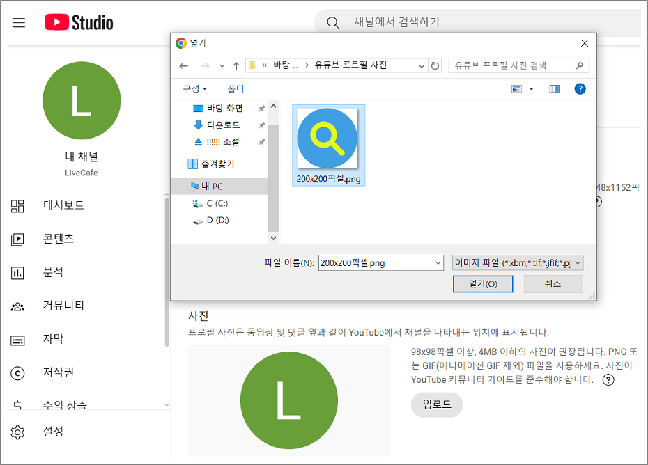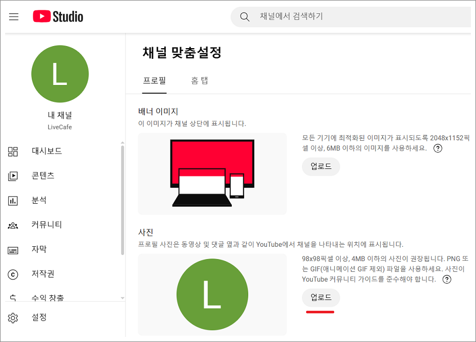 유튜브 프로필 사진을 변경할 때 사용하는 사진 사이즈 및 용량은 98x98픽셀 이상, 4MB 이하, png 또는 gif 파일 이미지를 사용합니다.