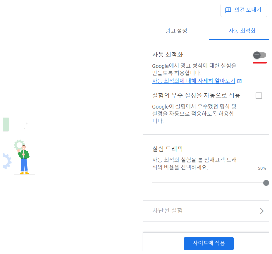 왼쪽 메뉴에서 광고 선택 > 해당 사이트 연필 모양 > 자동 최적화 선택해서 해제합니다.
