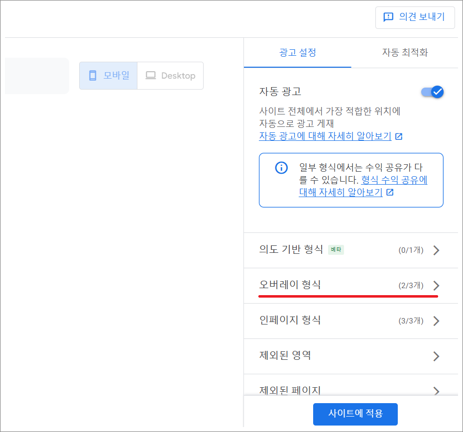 2. 광고 설정에서 오버레이 형식 선택합니다.