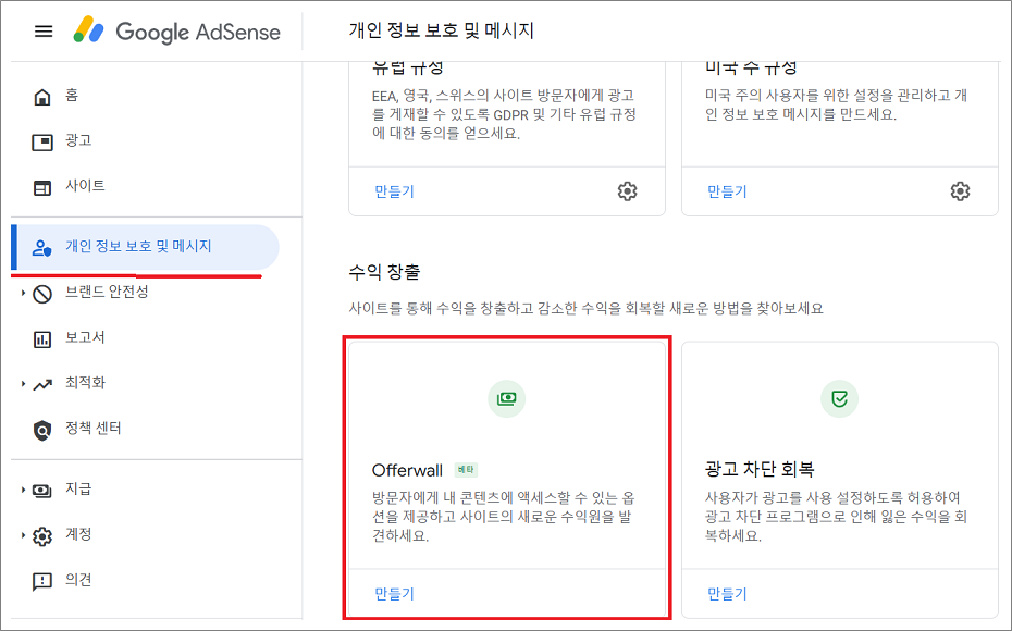 2. 오퍼월 광고 끄는 법 : 개인 정보 보호 및 메시지 > Offerwall 광고 선택 > 게시 버튼 끄거나 오퍼월 광고 삭제.