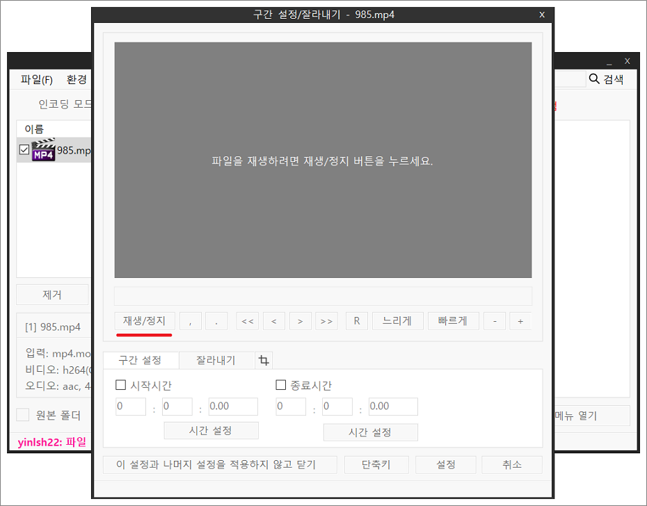 재생바, 화살표 등으로 시간을 설정할 경우 자르기를 원하는 화면이 나타나면 시간 설정 버튼을 선택하거나 직접 자르는 구간 시간을 입력합니다.
