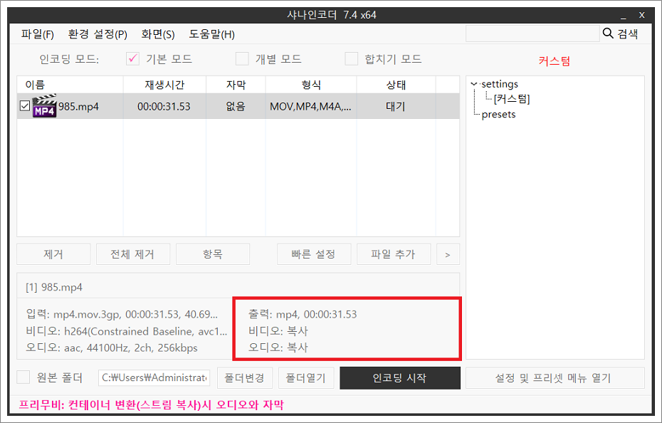 2. 동영상을 추가하면 입력 정보와 출력 정보가 표시됩니다.