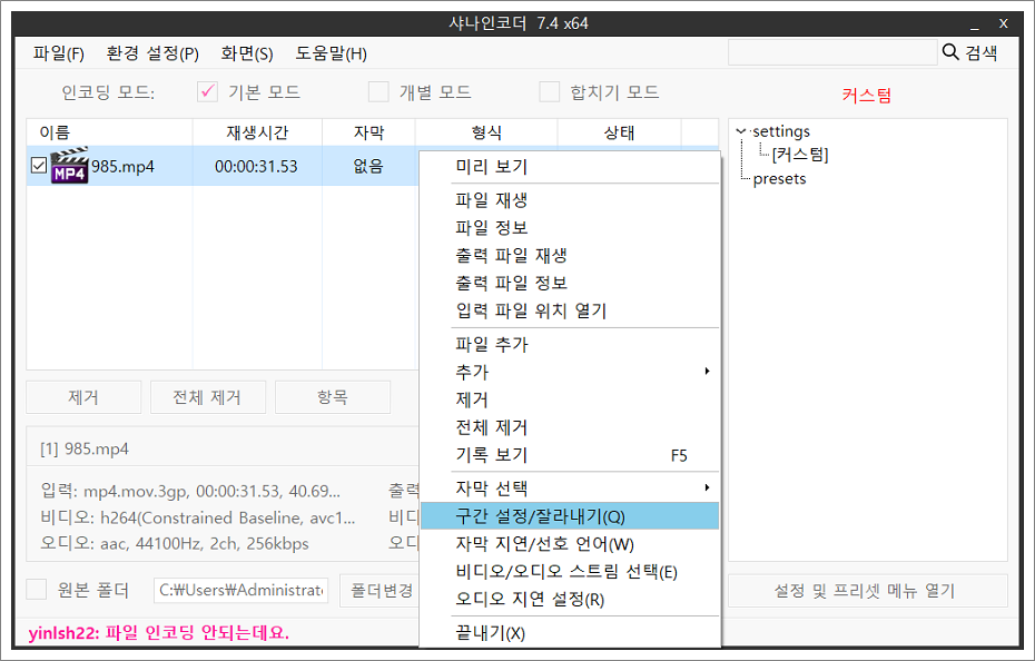 동영상 자르기 프로그램은 여러 가지가 있지만 샤나인코더는 무료 동영상 편집 프로그램이고 무설치(포터블)도 가능합니다.