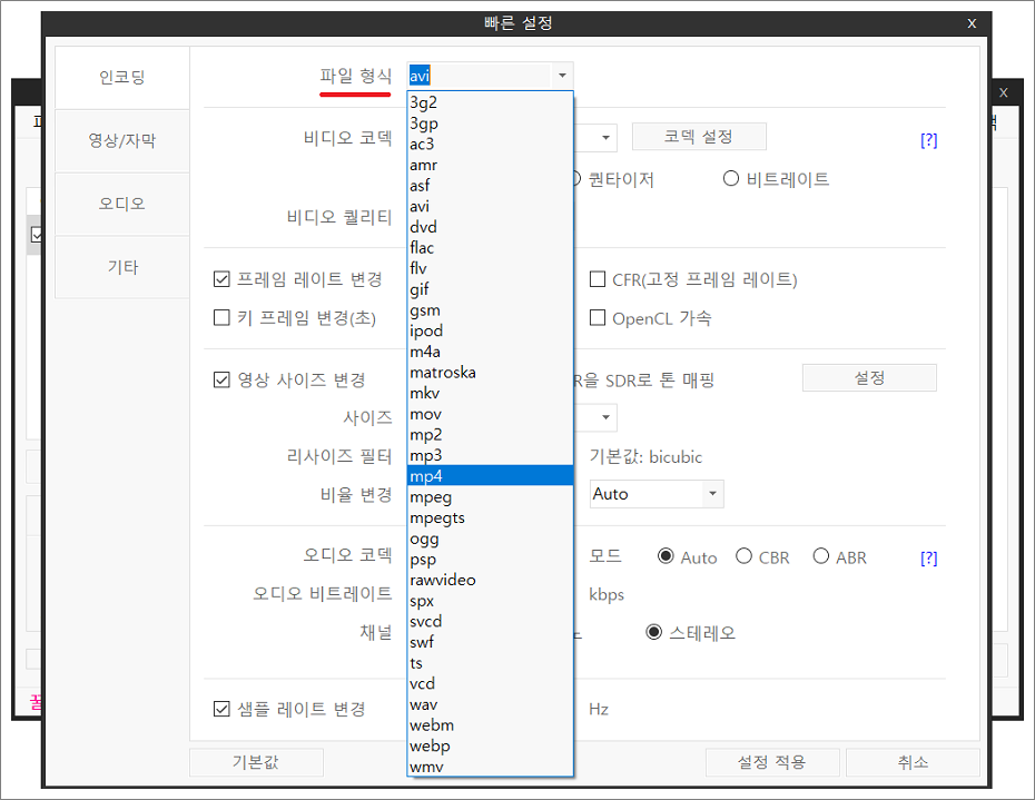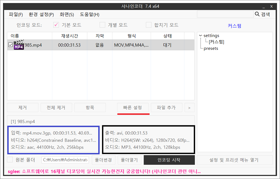 동영상 자르기는 인코딩이 필요 없기 때문에 출력 정보를 변경하기 위해서 빠른 설정을 선택합니다.