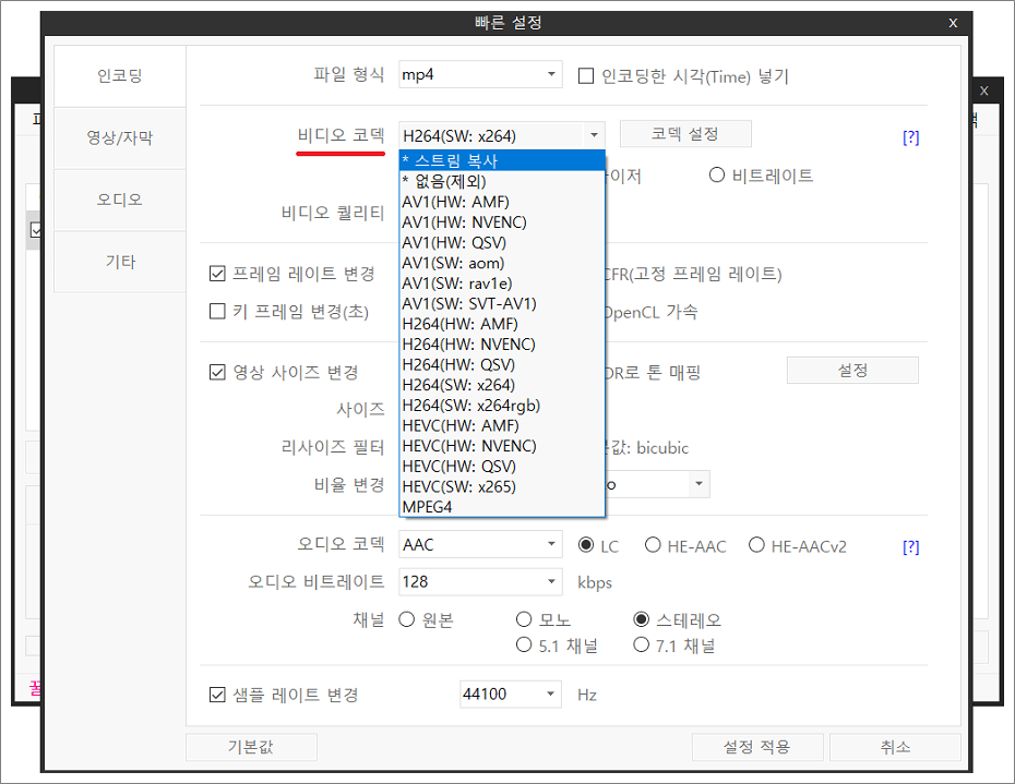 5. 오디오 코텍도 스트림 복사로 선택한 후 설정 적용합니다.