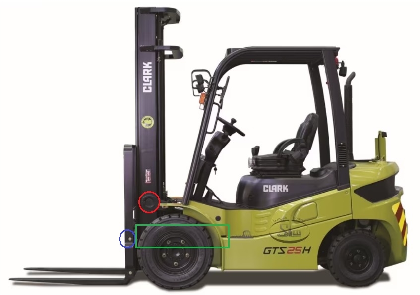 ①. 코스 회전 및 포크 높이 맞출 때 지게차의 기준 부분이 기종마다 다릅니다.