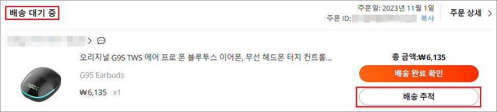 ①. 1일 정도 지나면 "발송 예정"이 "배송 대기 중"으로 변경이 되고, 빨간 네모칸에도 "배송 완료 확인", "배송 추적" 2개의 새로운 메뉴가 나옵니다.