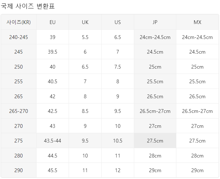 중국 신발 사이즈로 차후 중국 온라인 쇼핑몰에서 구입하면 그나마 사이즈가 맞을 확률이 높습니다.