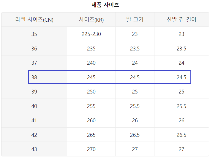 국제사이즈 변환표를 보면 240cm는 38cn입니다.