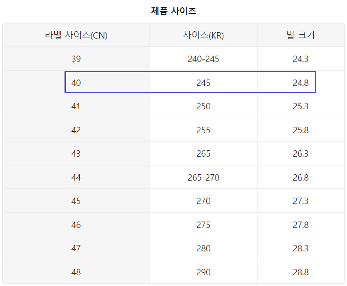 신발회사의 사이즈에 따라 240cm인 경우 39cn~37cn으로 2cn(1cm) 차이가 있습니다.