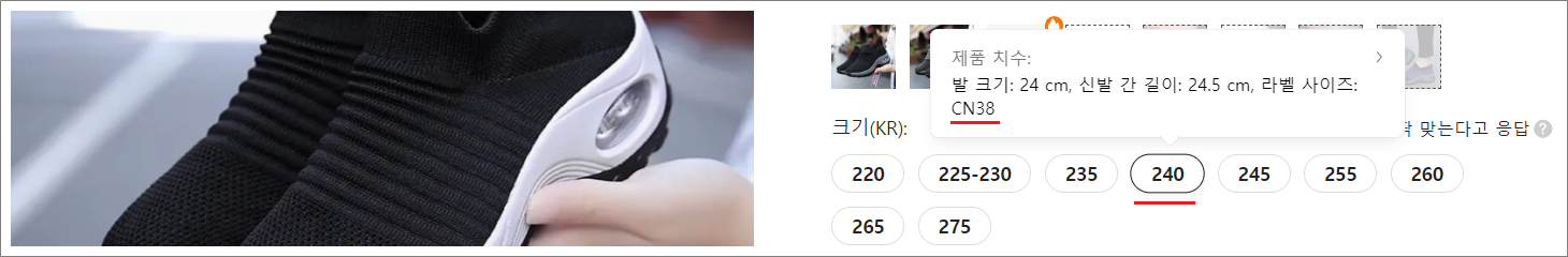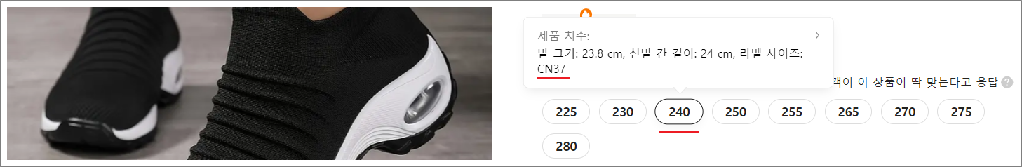 인터넷 쇼핑몰에서 240cm 사이즈를 구입하면 신발이 240cm에 맞게 제작된 것이 아니라 중국의 37cn~39cn 사이즈를 240cm로 표기해서 판매한다는 뜻입니다.